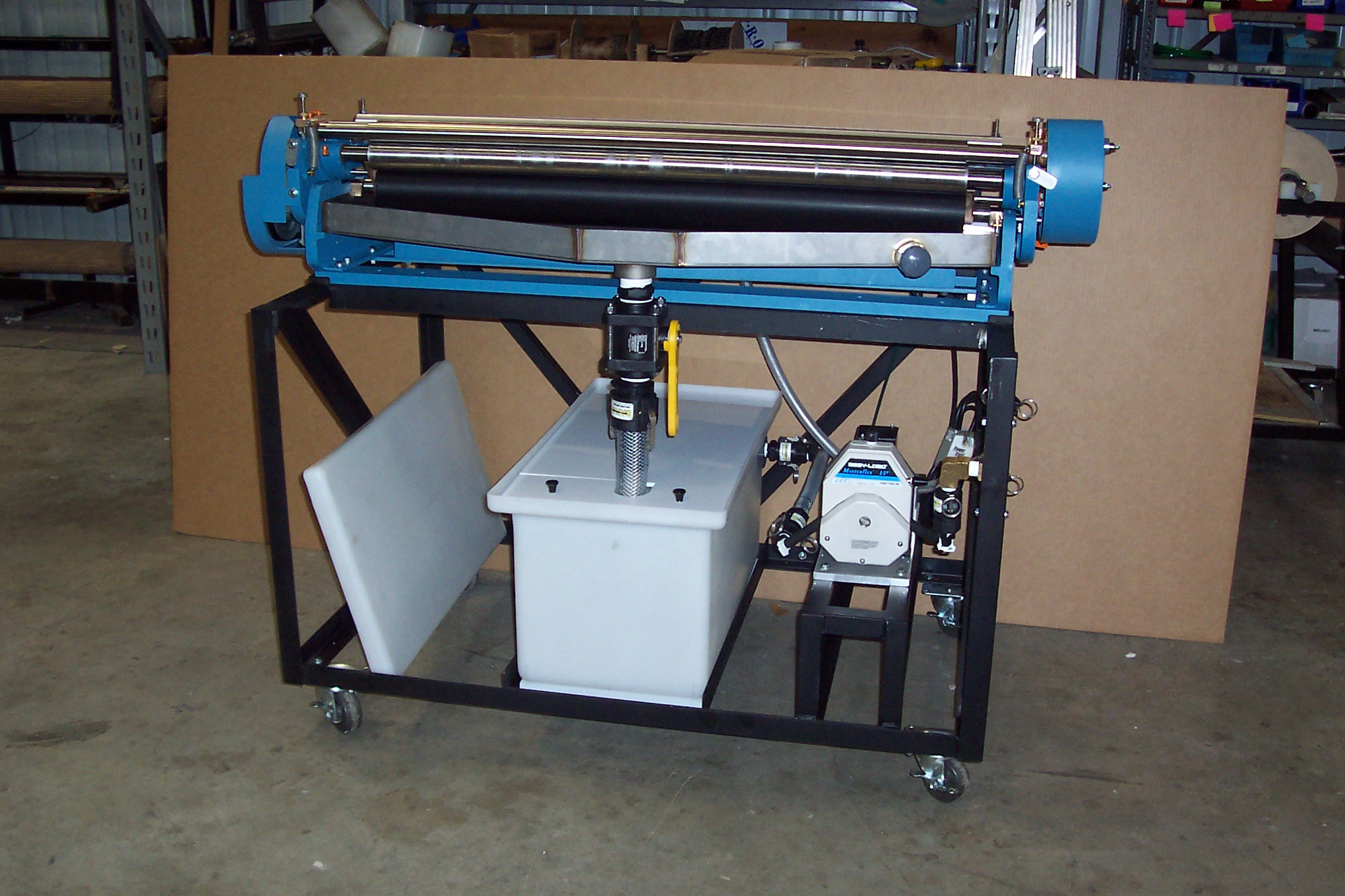 The adhesive recirculation system consists of an adhesive reservoir, variable speed pump, and appropriate fittings to connect the system to the glue tank of a rollcoater. The components are mounted on a plate to fit into the stand below a gluing machine.