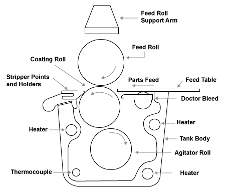 A powered silicone covered feed roll presses the part against the coating roll to be sure that it receives a full coating of adhesive.