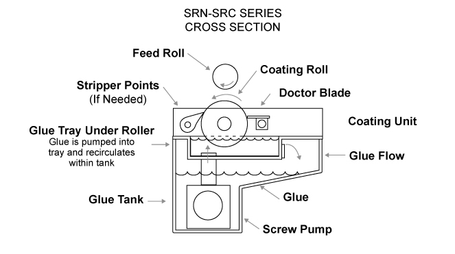 INTERNAL PUMP: A unique style of screw pump is built into the bottom of the adhesive tank. The pump keeps adhesive flowing from the bottom of the tank to the tray located under the coating roll. This constant flow keeps adhesive from skinning over, and keeps the level of adhesive touching the roll constant regardless of the overall level in the tank.